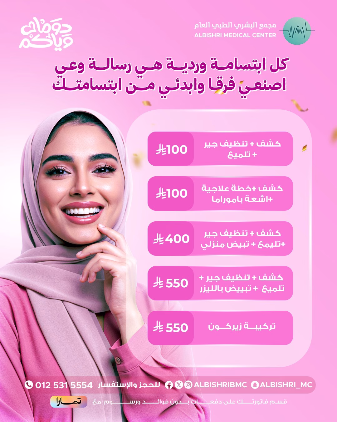 عرض شهر الحياة، شهر الأمل، شهر التوعية مجمع البشري الطبي العام عرض شهر الحياة، شهر الأمل، شهر التوعية مجمع البشري الطبي العام باقات قسم طب الأطفال باقات قسم الأسنان باقات قسم النساء والولادة باقات العلاج الطبيعي باقات قسم المختبر باقات الأنف والأذن والحنجرة باقات المسالك البولية باقات قسم طب الأطفال ⇧ باقات قسم الأسنان ⇧ باقات قسم النساء والولادة ⇧ باقات قسم العلاج الطبيعي ⇧ باقات قسم المختبر ⇧ باقات عيادة الأنف والأذن والحنجرة ⇧ باقات عيادة المسالك البولية ⇧ احجز معنا حجز باقة سيقوم موظفوا خدمة العملاء بالتواصل معكم لتثبيت الموعد او الرد على استفساركم حجز من صفحة العروض والباقات اختر الباقة كشف + تنظيف جير + تلميع - 100 ﷼ كشف + خطة علاجية + أشعة بانوراما - 100 ﷼ كشف + تنظيف جير + تلميع + تبييض منزلي - 400 ﷼ كشف + تنظيف جير + تلميع + تبييض بالليزر - 550 ﷼ تركيبة زيركون - 550 ﷼ كشف + سونار - 99 ﷼ خصم 30% على تحاليل الولادة تركيب اللولب فقط - 399 ﷼ تركيب + اللولب - 499 ﷼ إزالة شريحة الحمل - 360 ﷼ إرسال حجز من صفحة العروض والباقات اختر الباقة باقة التحاليل الدورية باقة فقر الدم اي تحاليل بـ 95 ﷼ اختر فحصك بـ 19 ﷼ كشف + تنظيف جير + تلميع - 95 ﷼ كشف + خطة علاجية + أشعة بانوراما - 95 ﷼ كشف + تنظيف جير + تلميع + تبييض بالليزر - 395 ﷼ كشف + تنظيف جير + تلميع + تبييض منزلي - 295 ﷼ تركيبة زركون - 395 ﷼ حشوات تجميلية - 95 ﷼ باقة عياة الأطفال باقة النمو كشف + سونار - 95 ﷼ مسحة عنق + مهبلية - 480 ﷼ كشفية - خصم 50% بدون منظار كشف بالمنظار - 95 ﷼ خصم 30% على التحاليل كشفية - خصم 50% تحاليل - خصم 30% عرض الختان باقة جلسات العلاج الطبيعي باقة جلسات الشوك ويف باقة شد الفقرات إرسال